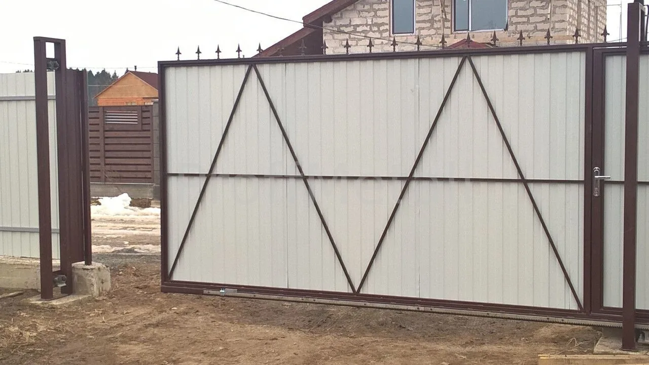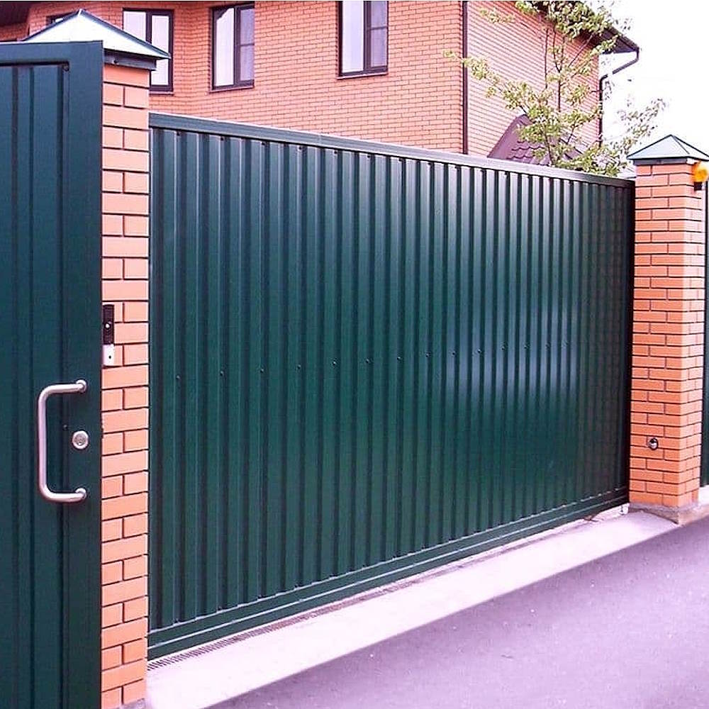 Откатные ворота из профнастила с встроенной калиткой и автоматикой